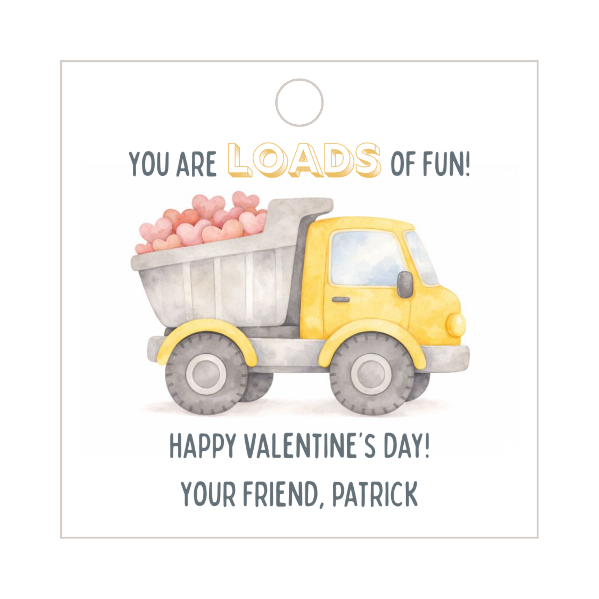 Perfect for little builders and truck-loving Valentines, this playful tag adds a fun touch to classroom exchanges, treat bags, and Valentine gifts. A great choice for kids’ parties, school celebrations, or gift add-ons.