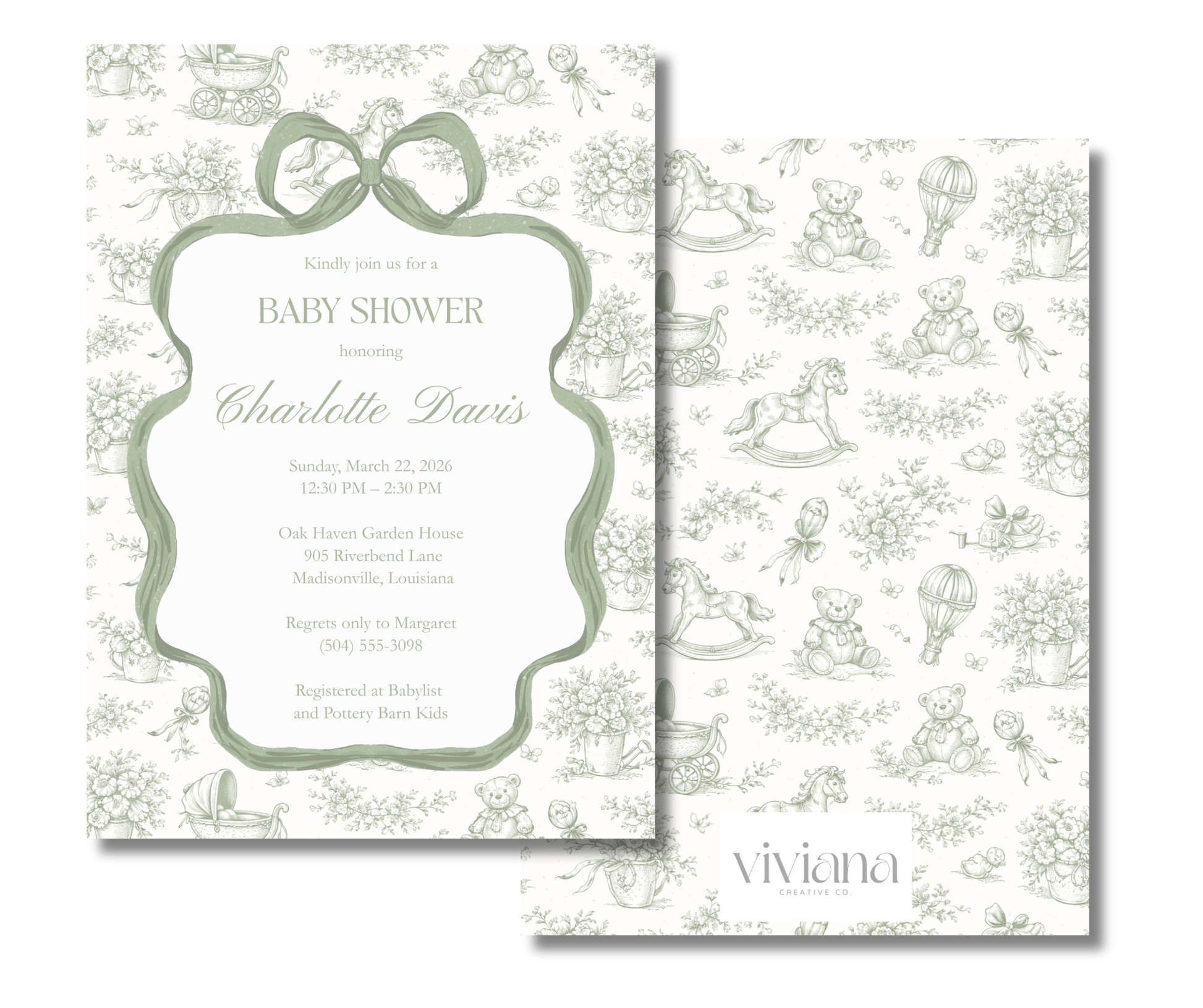 Our Sage Bow Heirloom Baby Shower Invitation features a hand-illustrated sage bow framing a classic toile nursery pattern of rocking horses, prams, teddy bears, florals, and hot air balloons. The sculpted frame and refined typography create a timeless, Southern heirloom aesthetic.